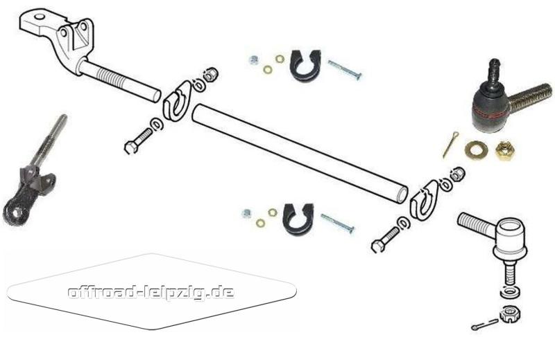 Lieferumfang: Spurstange kmpl. mit beiden Lenkstangenköpfen rechts und links, Lenkstange (Rohr), 2x Rohrklammern/Schellen mit Schrauben u. Muttern.